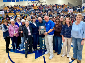 Family and team members of the Eaglette 1964 and 1974 state championship teams gathered at the Shelbyville Central basketball game on Friday night to present a plaque to SCHS principal Charlie Pope in memory of late legendary Eaglette coach Bobby Locke. The plaque will be displayed between the two state championship trophies located in the foyer of the gym.